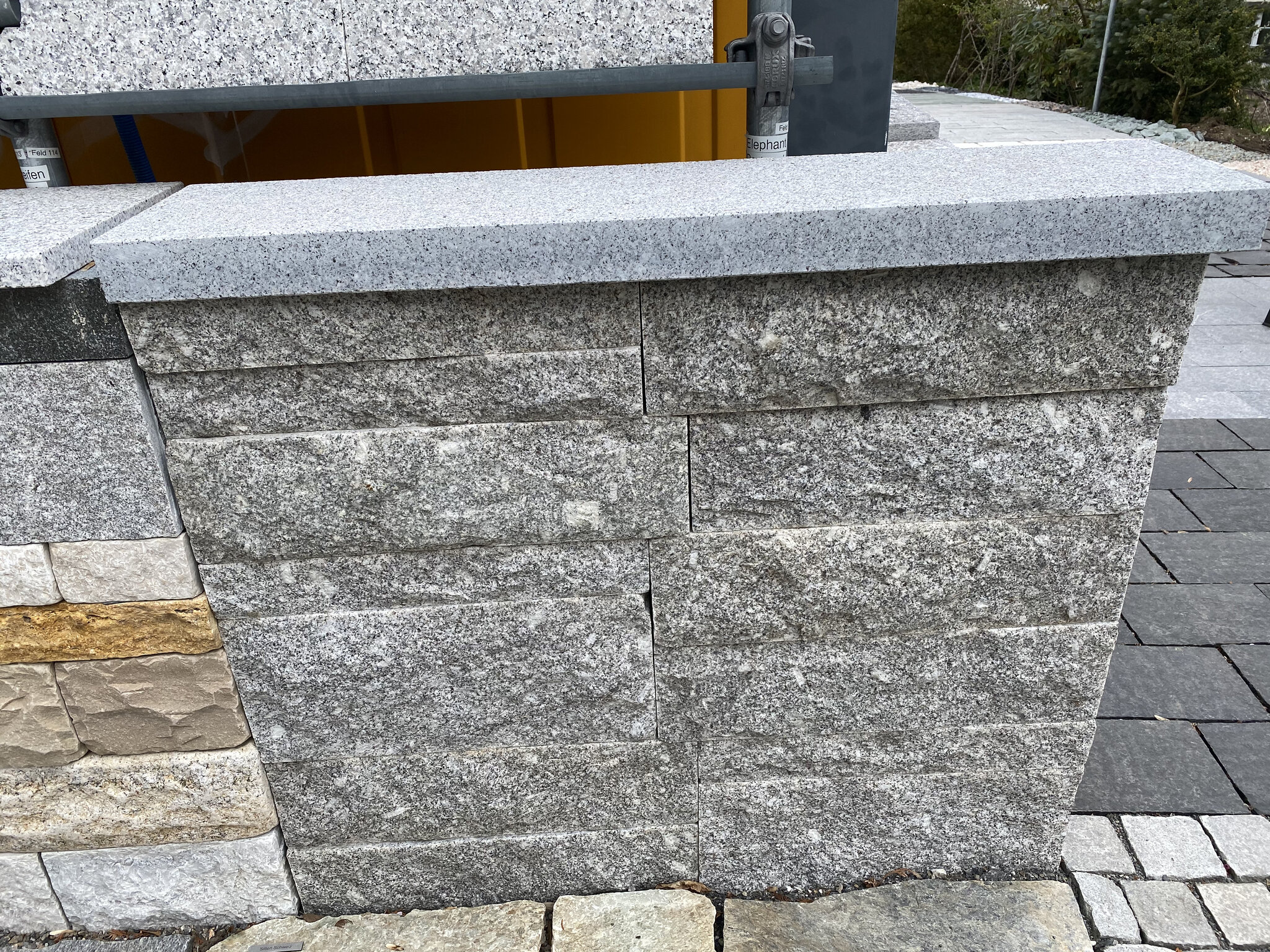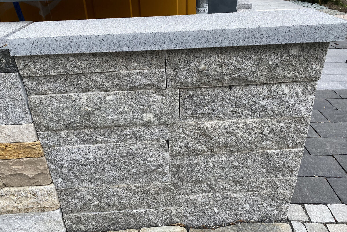 Kleinmauerstein Rebmauerwerk Höhe: 7.5 cm (15%), 15 cm (45%) und 22.5 cm (40%) Tiefe: 20 cm Länge: 40-60 cm Ansichtsfläche: Zweiseitig gespalten, Kanten gesägt und zurückgeschlagen
