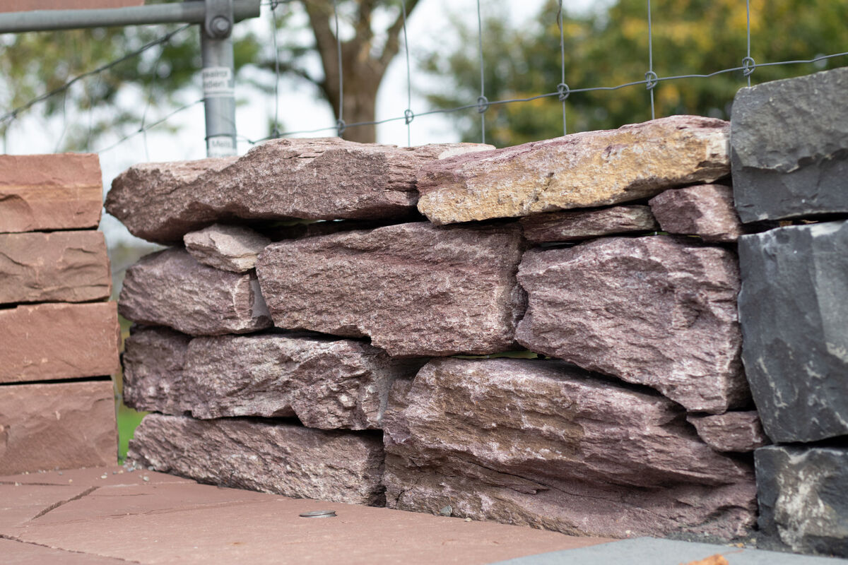 Kleinmauersteine, Wildformplatten, Tisch und Bänke.