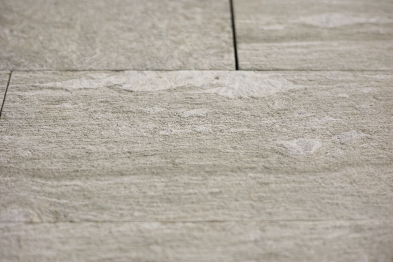 Glimmergneis/-Schiefer aus Vals im Kanton Graubünden. Der Stein ist grau mit hellen Adern (teils Einschlüssen). Er ist frost- ,säurefest und abriebbeständig.